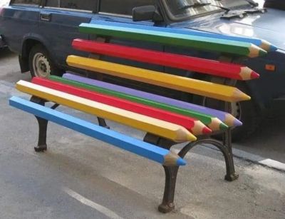 Ce banc au design visuellement frappant conçu avec d'énormes crayons de couleur, rouge, bleu, jaune, etc...