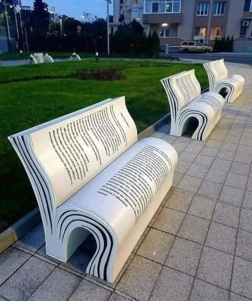 L’art public et le mobilier urbain ont parfois des créations des plus surprenantes comme ses bancs et sièges incroyablement créatifs venant du monde entier dont cet ensemble de bancs conçus pour ressembler à des livres ouverts, avec du texte imprimé, tapissent une passerelle piétonne et où la créativité offre un endroit confortable pour s’asseoir et réfléchir...