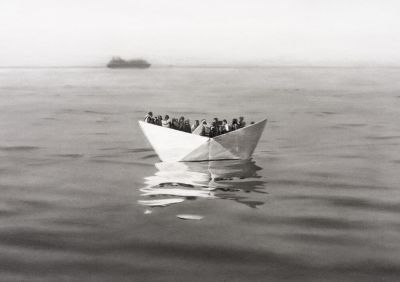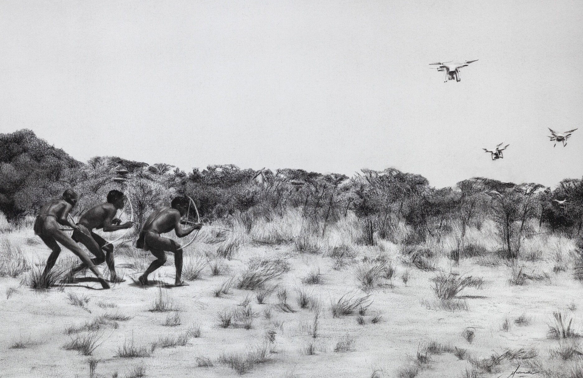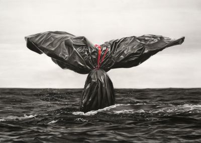 Après avoir maîtrisé le dessin au fusain et les techniques de la sérigraphie, Paul et Simon pratique depuis 2021 la peinture sur toile et la création de sculptures en bronze. Avec cette toile de baigneurs qui bronzent sur la glace, le duo dénonce le paradoxe absurde des situations liées au changement climatique.