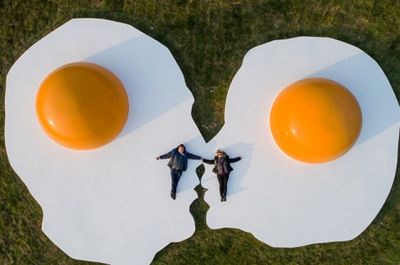 Son installation d'art créatif Giant Kissing Fried Eggs a été réalisée près du lac Donghu à Wuhan, en Chine, présentant des sculptures géantes d'œufs frits façonnés dont certaines ressemblent à des personnes en train de s'embrasser.