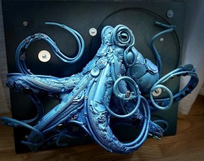Des sculptures réalisées à partir d'une variété de déchets, tels que des capsules de bouteilles, des balles de ping-pong, des ornements de Noël, des figurines d'action, des tubes en vinyle, des pièces de puzzle, etc...