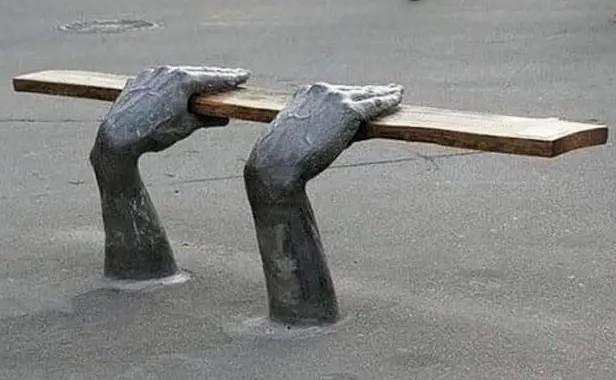 Un banc minimaliste conçu de manière créative où des mains géantes émergent du sol pour tenir le siège.