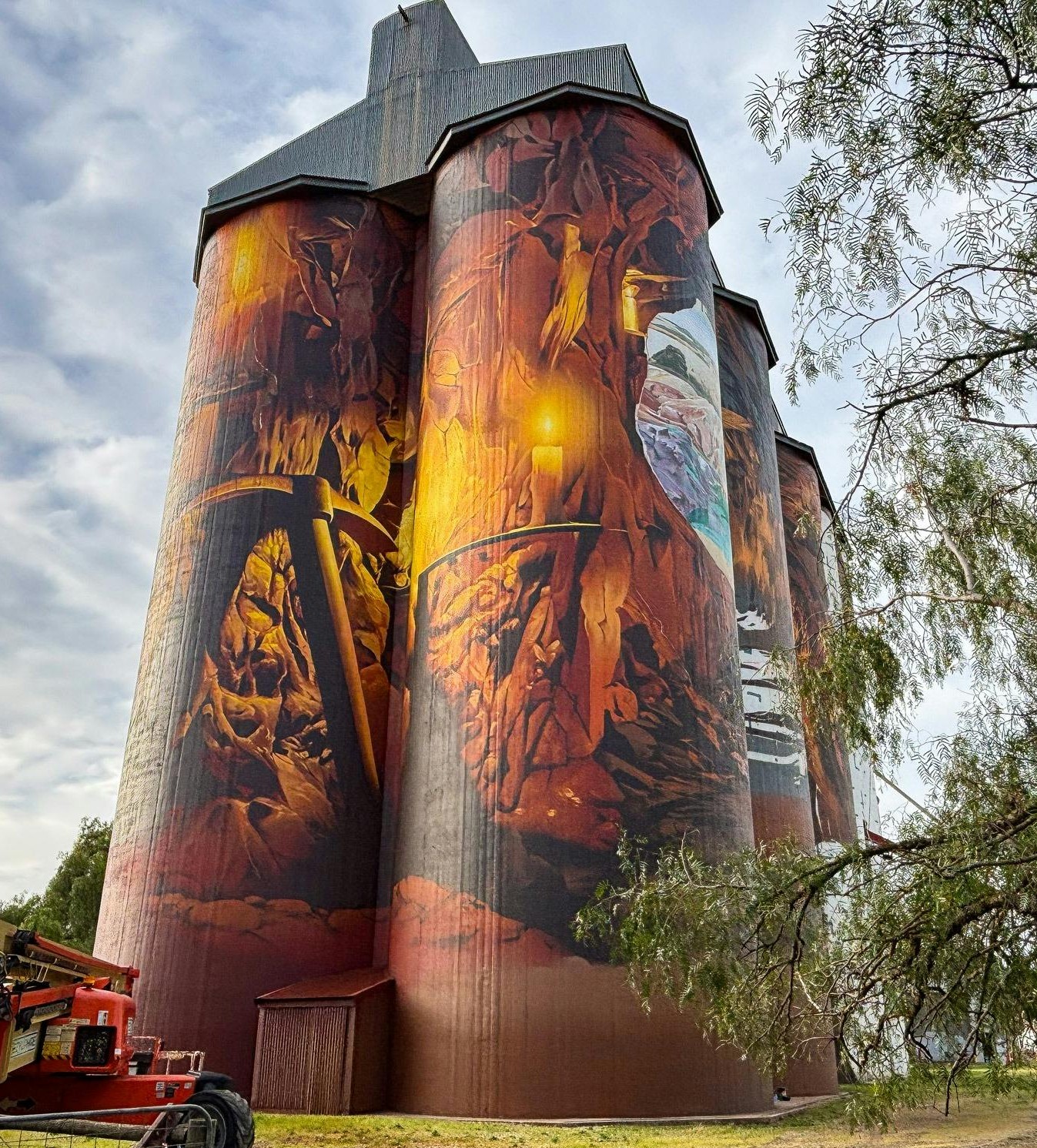 L'artiste australien Sam Bates, alias Smug, basé à Glasgow, Ecosse est connu pour ses fresques murales hyper-réalistes créées à l'aide de bombes aérosols dont cette création réalisée à grande échelle sur silo à grains à Hancock Road, Kapunda, Australie...