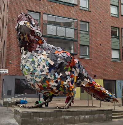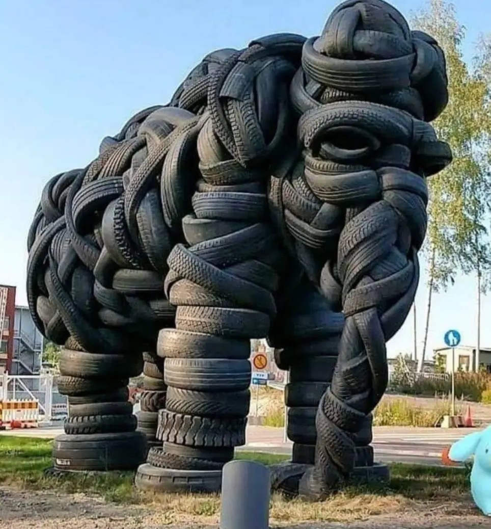 Le sculpteur estonien Villu Jaanisoo, vivant en Finlande, est connu pour ses œuvres réalisées à partir de matériaux recyclés, comme des pneus usagés. dont son éléphant de plus de 3 m de haut, réalisé à partir de centaines de pneus...