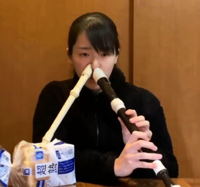 La flûtiste japonaise Haruka Tsujino, connu sous hakura_2go, originaire de Shima, dans la préfecture de Mie, Japon, peut jouer habilement de deux flûtes à bec simultanément et en harmonie avec son nez...