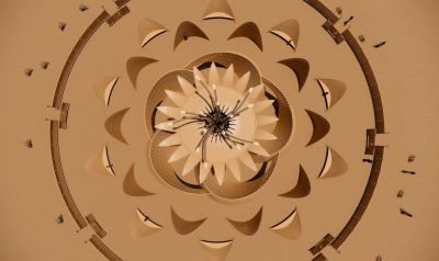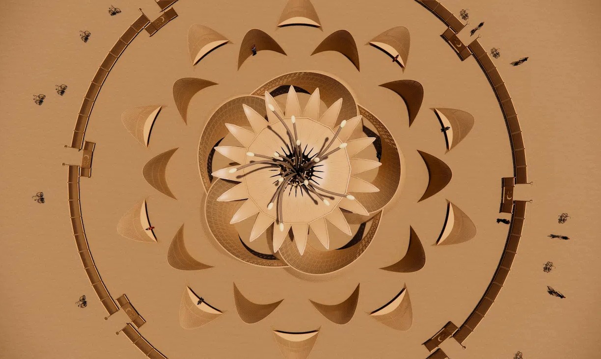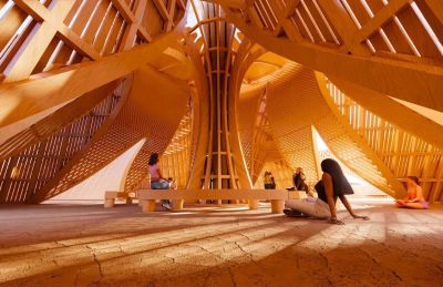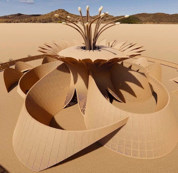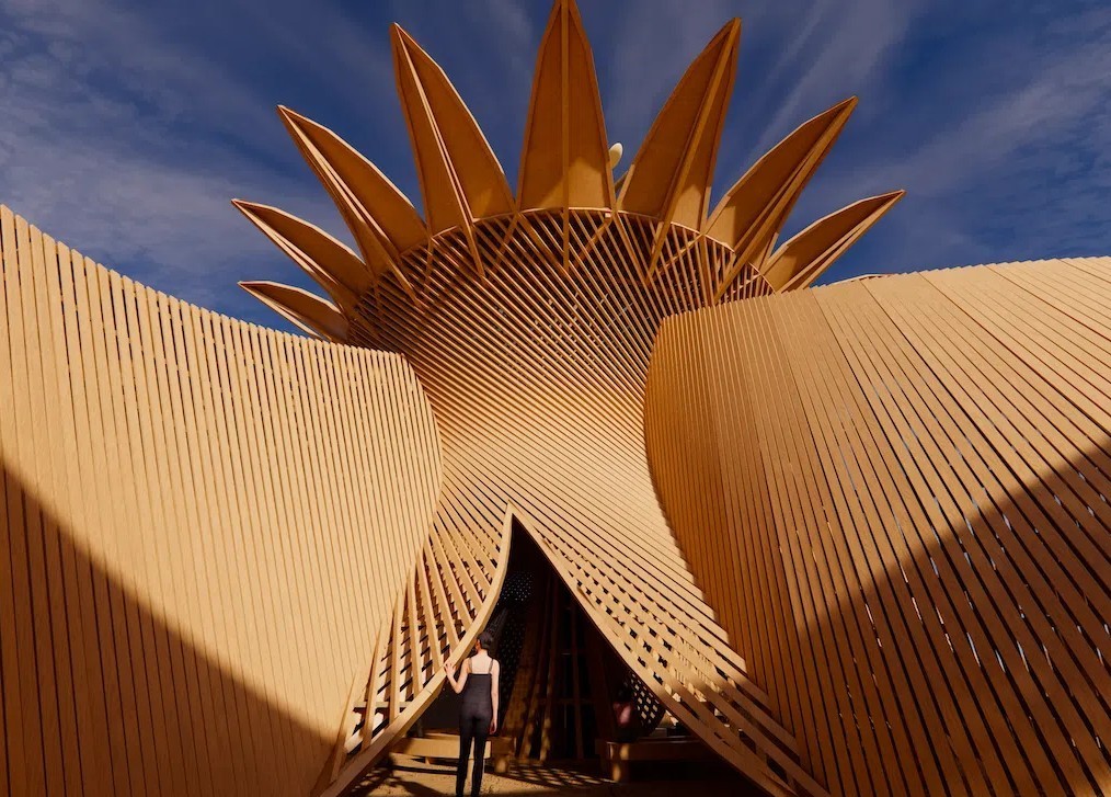 Ce temple est conçu selon une approche paramétrique, passant du dessin manuel à la génération algorithmique, permettant ainsi de créer des courbes complexes et organiques à partir de pièces de bois droites et où les courbes rayonnantes donnent une vision de pétales de fleurs, permettant ainsi aux visiteurs de traverser une transition progressive du désert ouvert vers un environnement intérieur plus ciblé.