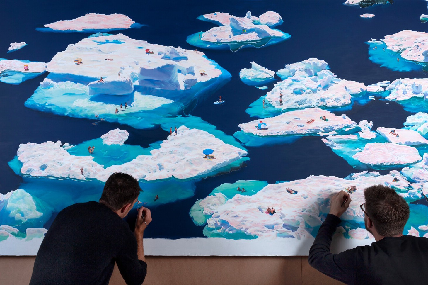 Après avoir maîtrisé le dessin au fusain et les techniques de la sérigraphie, Paul et Simon pratique depuis 2021 la peinture sur toile et la création de sculptures en bronze. Avec cette toile de baigneurs qui bronzent sur la glace, le duo dénonce le paradoxe absurde des situations liées au changement climatique.