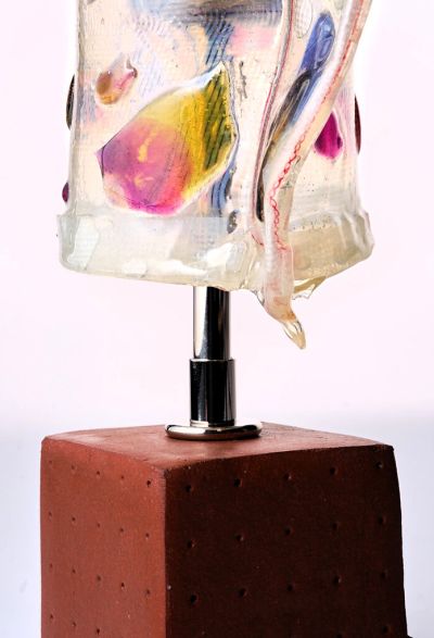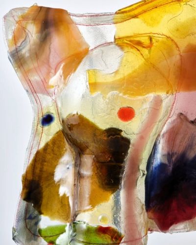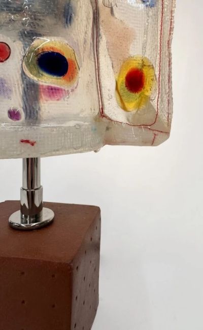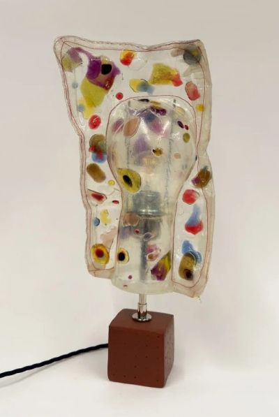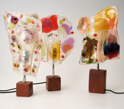 Avec sa série de luminaire iridescent Candy, chaque lampe associe des socles réalisés en céramique brute cirée et d'abat-jour en fibre de verre et résine, où les pigments fondus évoquent la texture fluide du bonbon ramolli sous l'effet de la chaleur, semblant ainsi couler ou flotter au-dessus de la lampe.